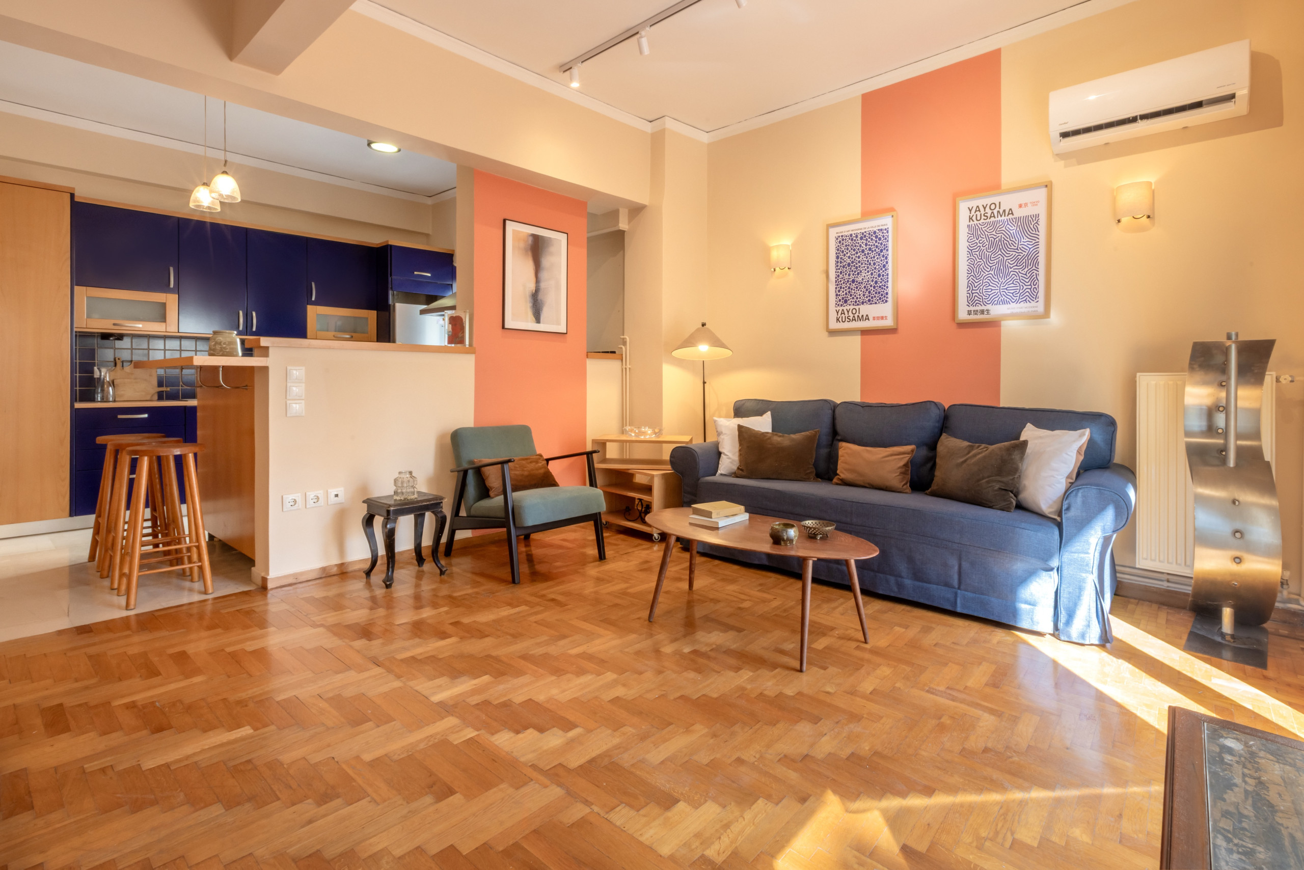 A bright open-plan living room with a blue sofa, wooden coffee table, armchair, and warm parquet flooring. The space connects to a small kitchen with blue cabinets and wooden stools, while sunlight, wall art, and soft lighting create a cosy, modern atmosphere.