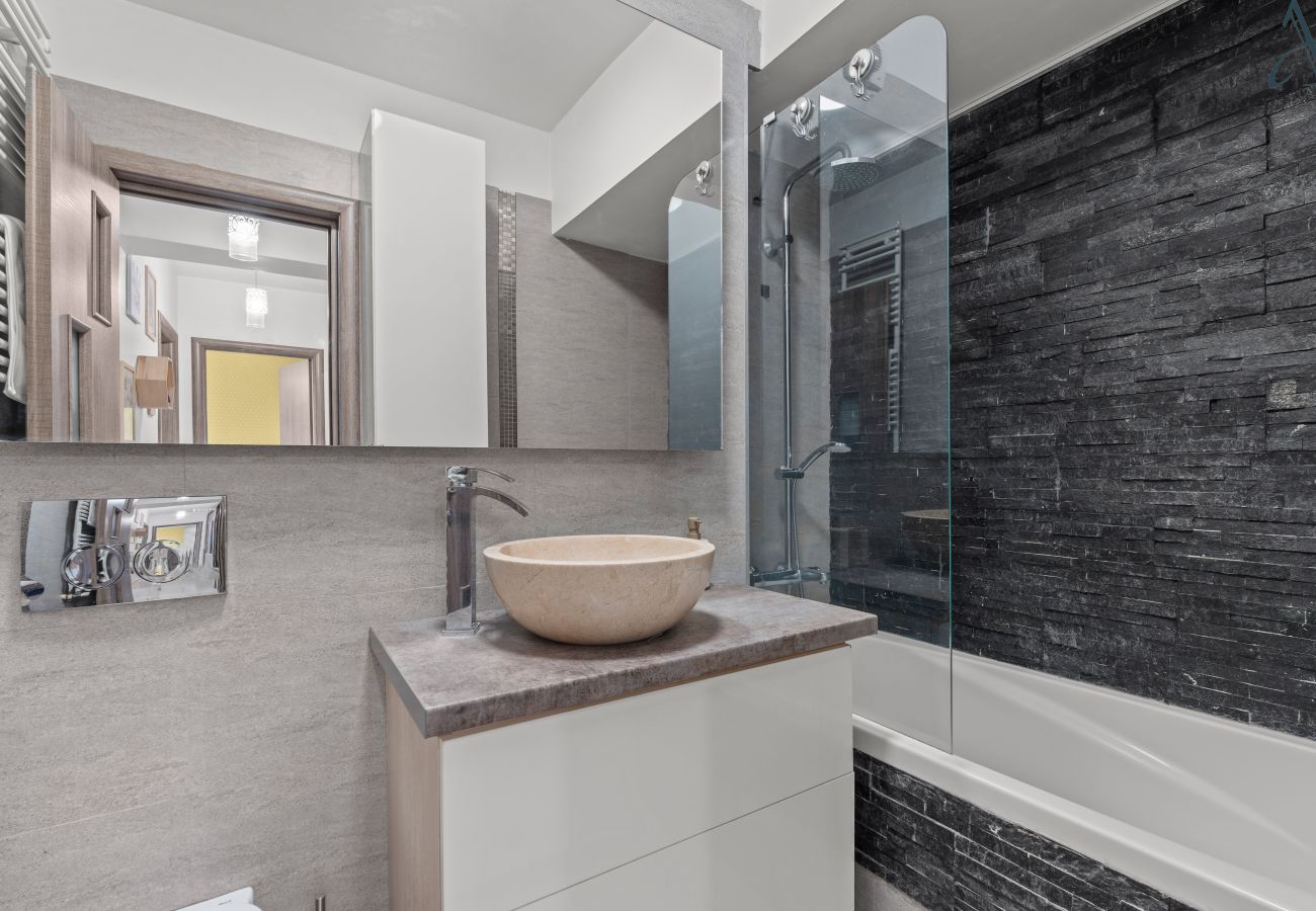 The apartment features a spacious bedroom with a luxurious king-size bed, ensuring a restful night's sleep. An additional sofa bed provides flexible accommodation for those travelling with a companion. The thoughtfully designed space maximises comfort and functionality, making it ideal for short-term stays.