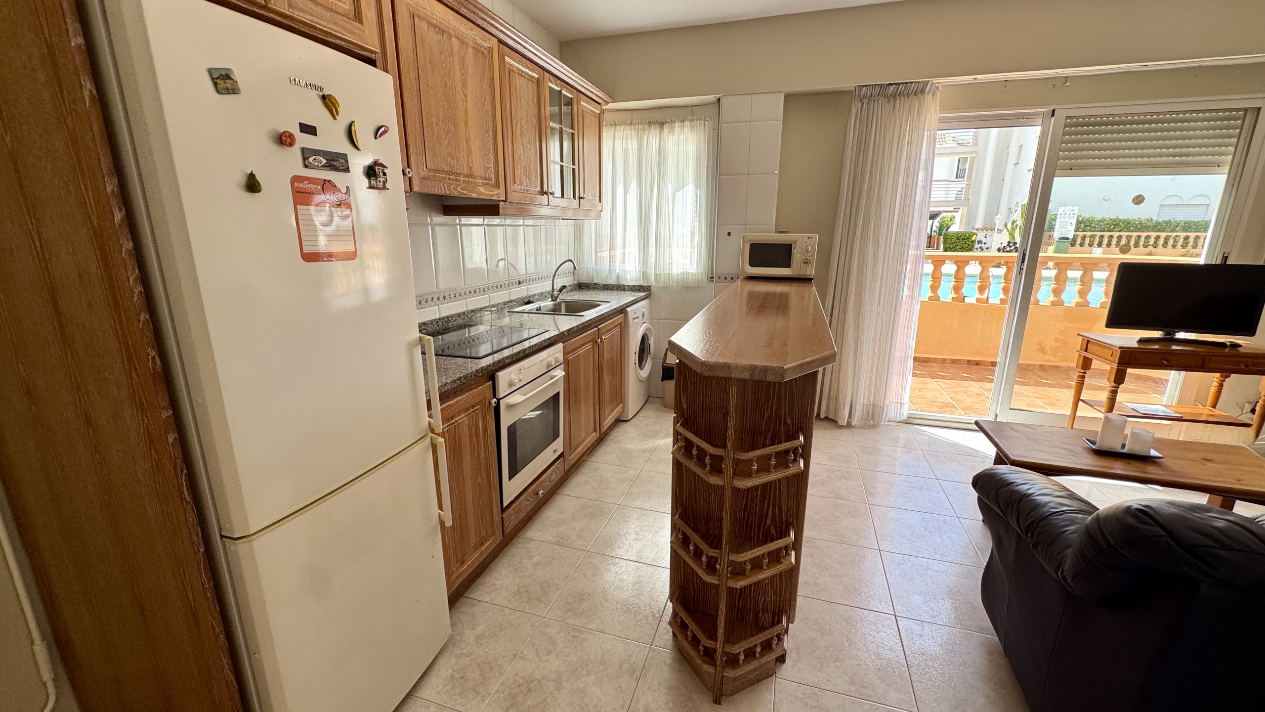 In the hotplate of glass ceramics open plan kitchen, refrigerator, microwave, oven, freezer, dishes/cutlery, coffee machine and toaster are provided.