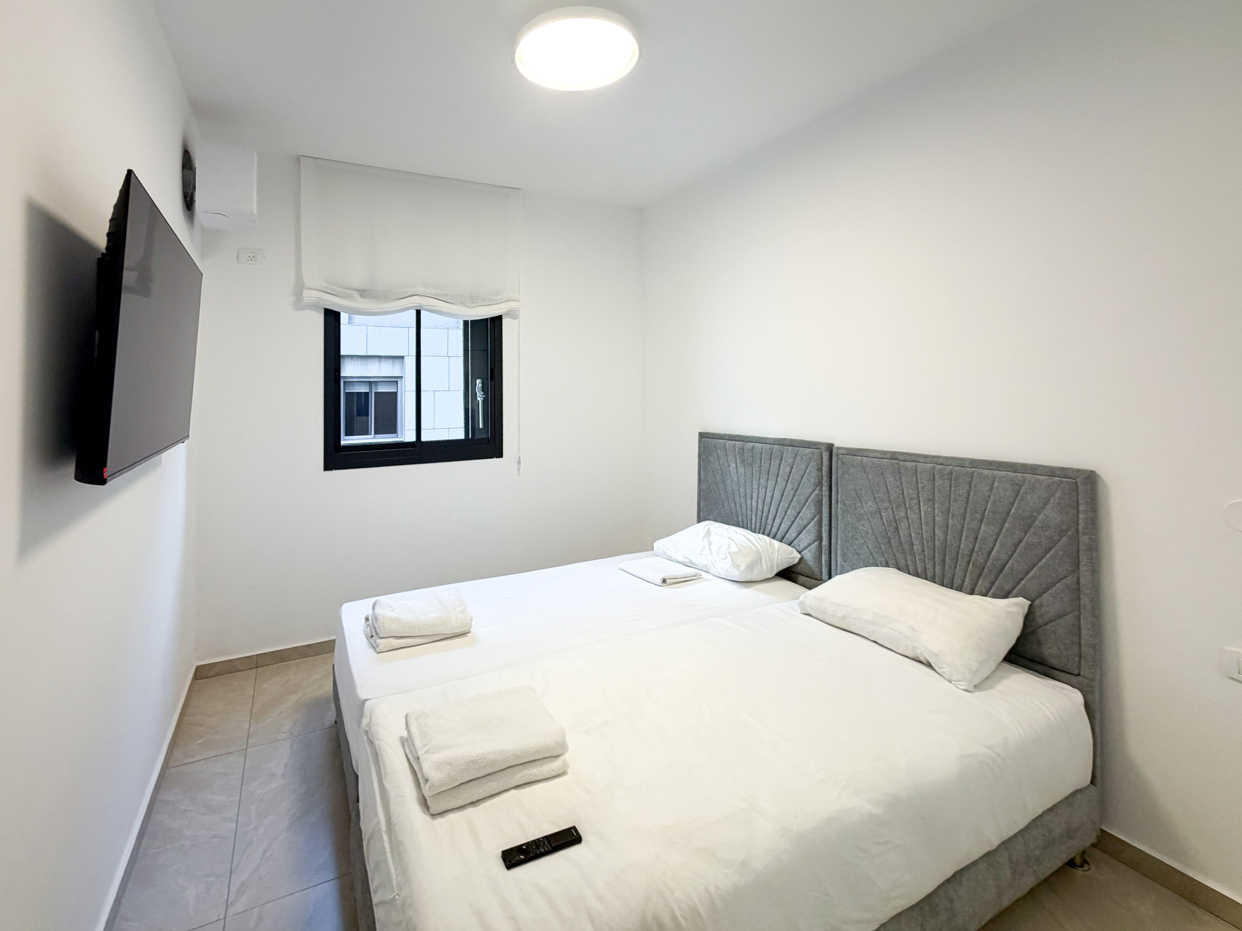 Bedroom 2: two single beds that can be configured into a queen-size bed, full-height closet, smart TV. This bedroom is also the MAMAD (safe room) in case of emergency.