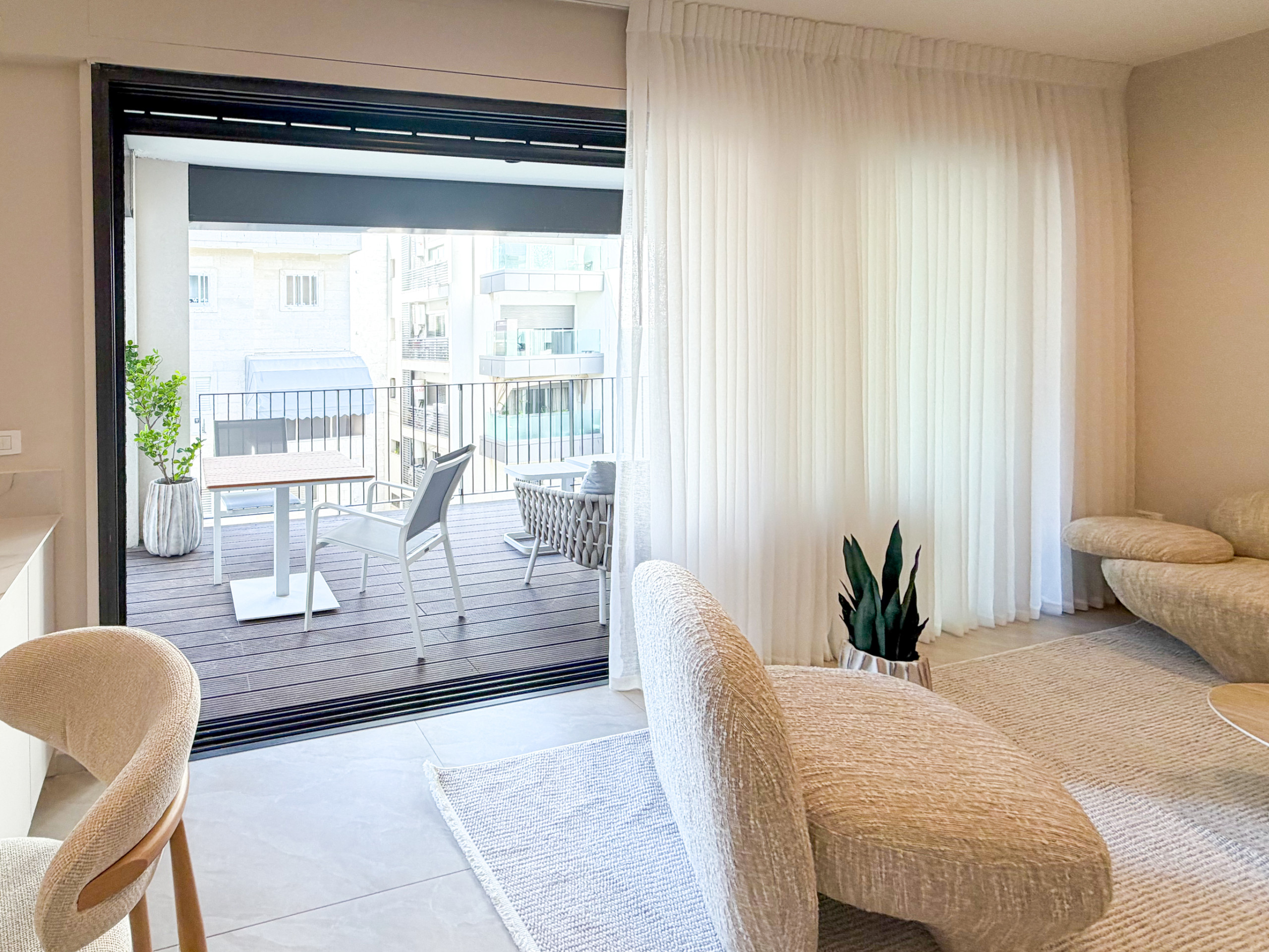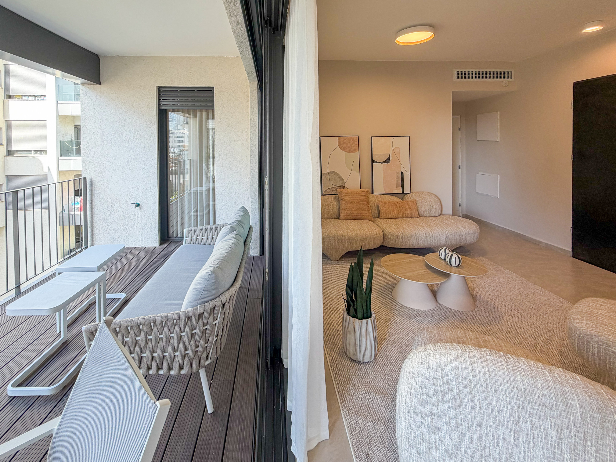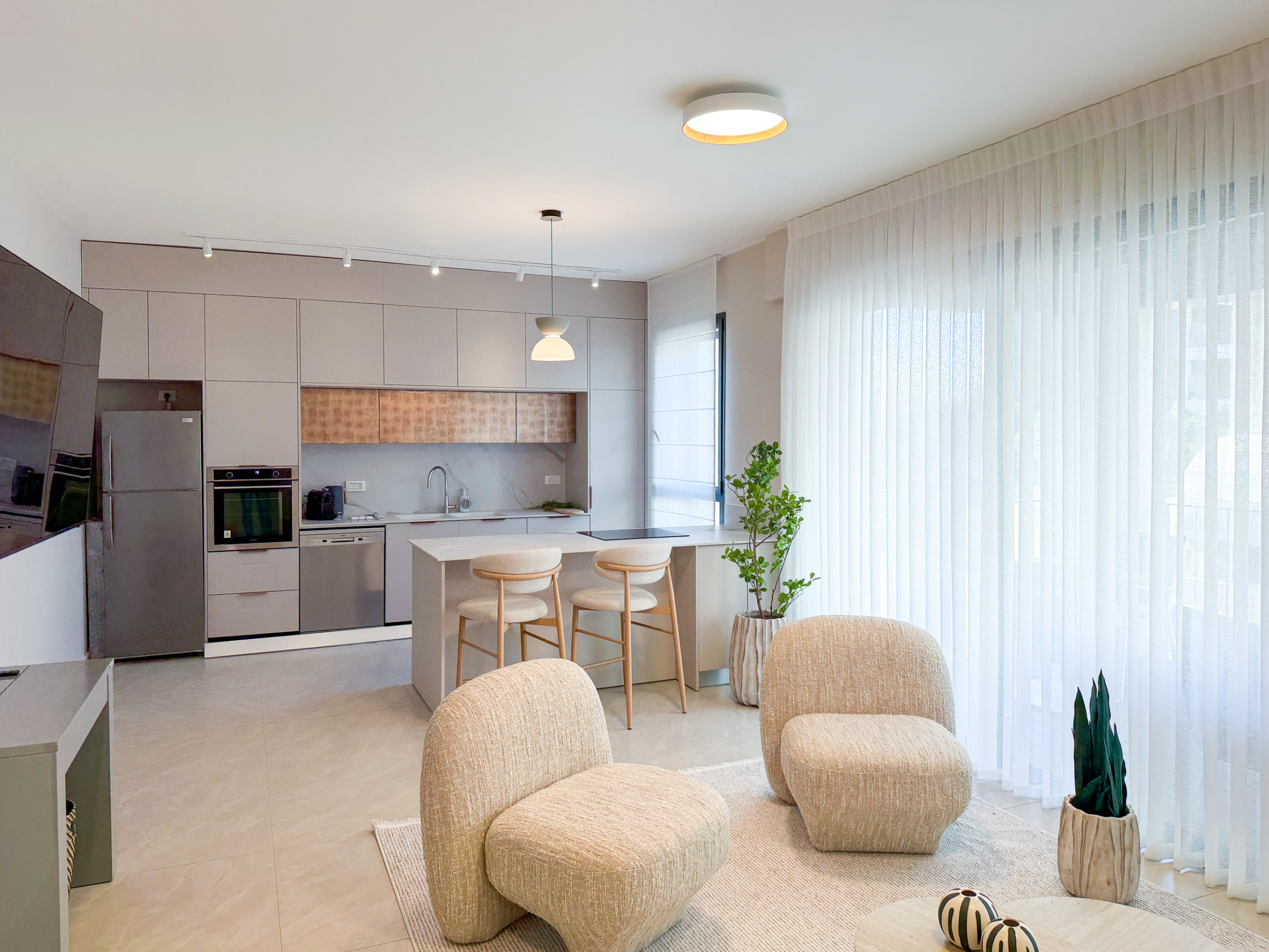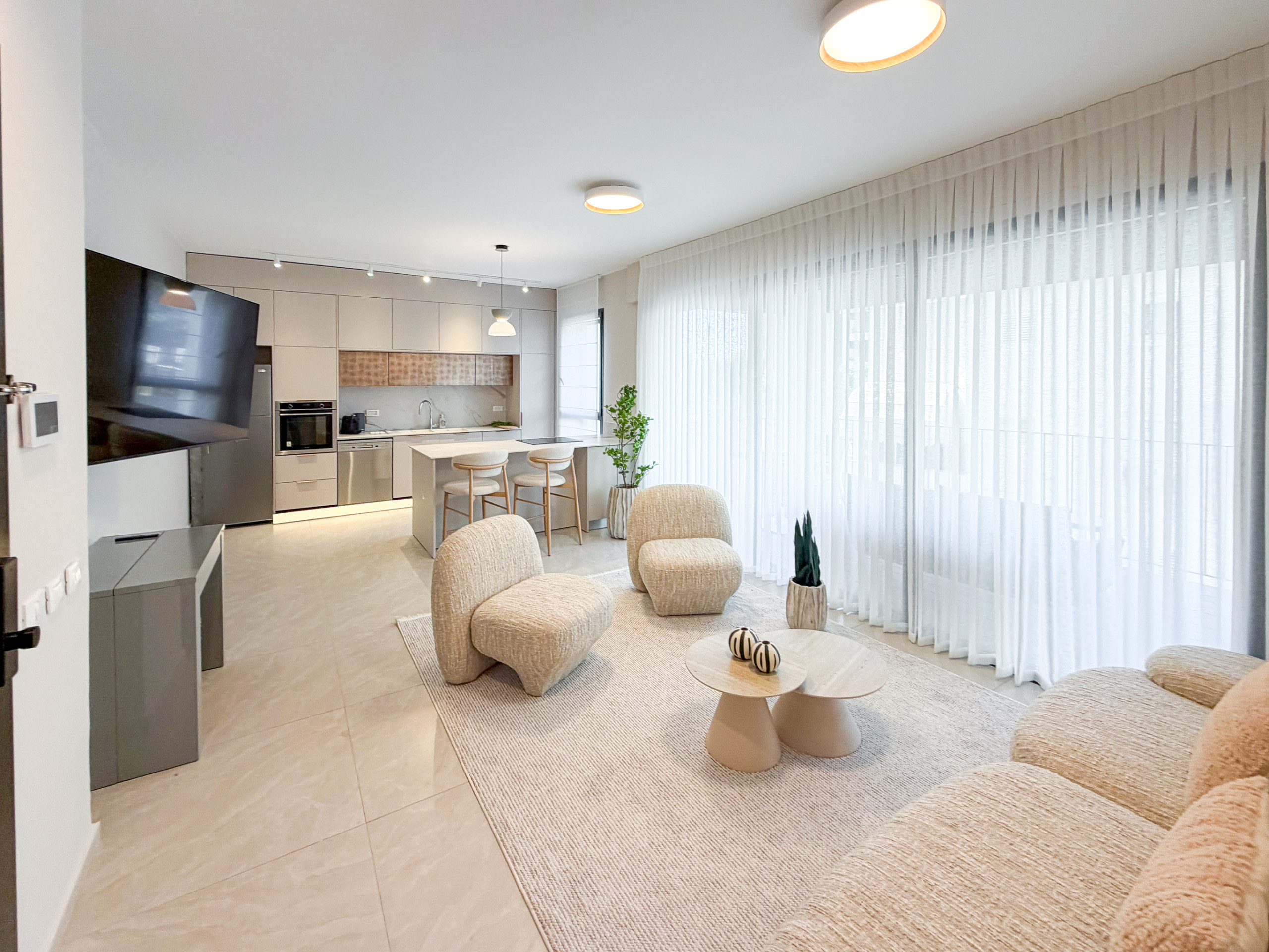 The apartment is brand new and tastefully furnished with high-quality materials throughout — from the sofas and beds to the kitchen utensils. The bright, open-plan living space combines a comfortable living room and a modern kitchen, with direct access to a lovely terrace.