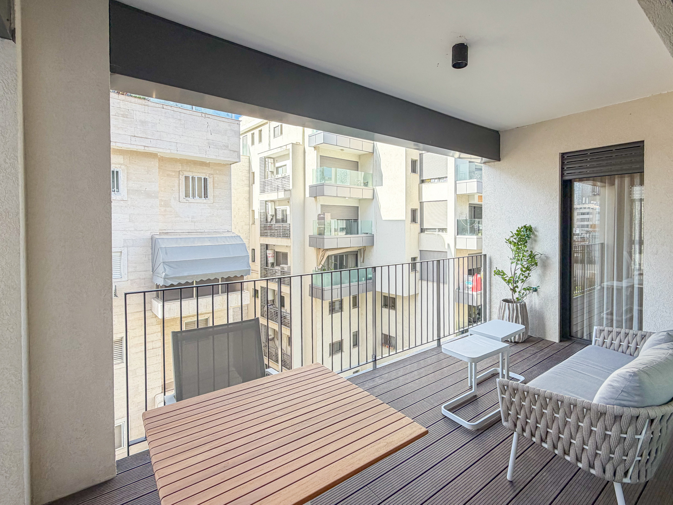 The living room features stylish, high-end sofas and a smart TV. Step out onto the balcony, where you’ll find a seating area with a coffee table and two chairs — the perfect spot to enjoy your morning coffee.