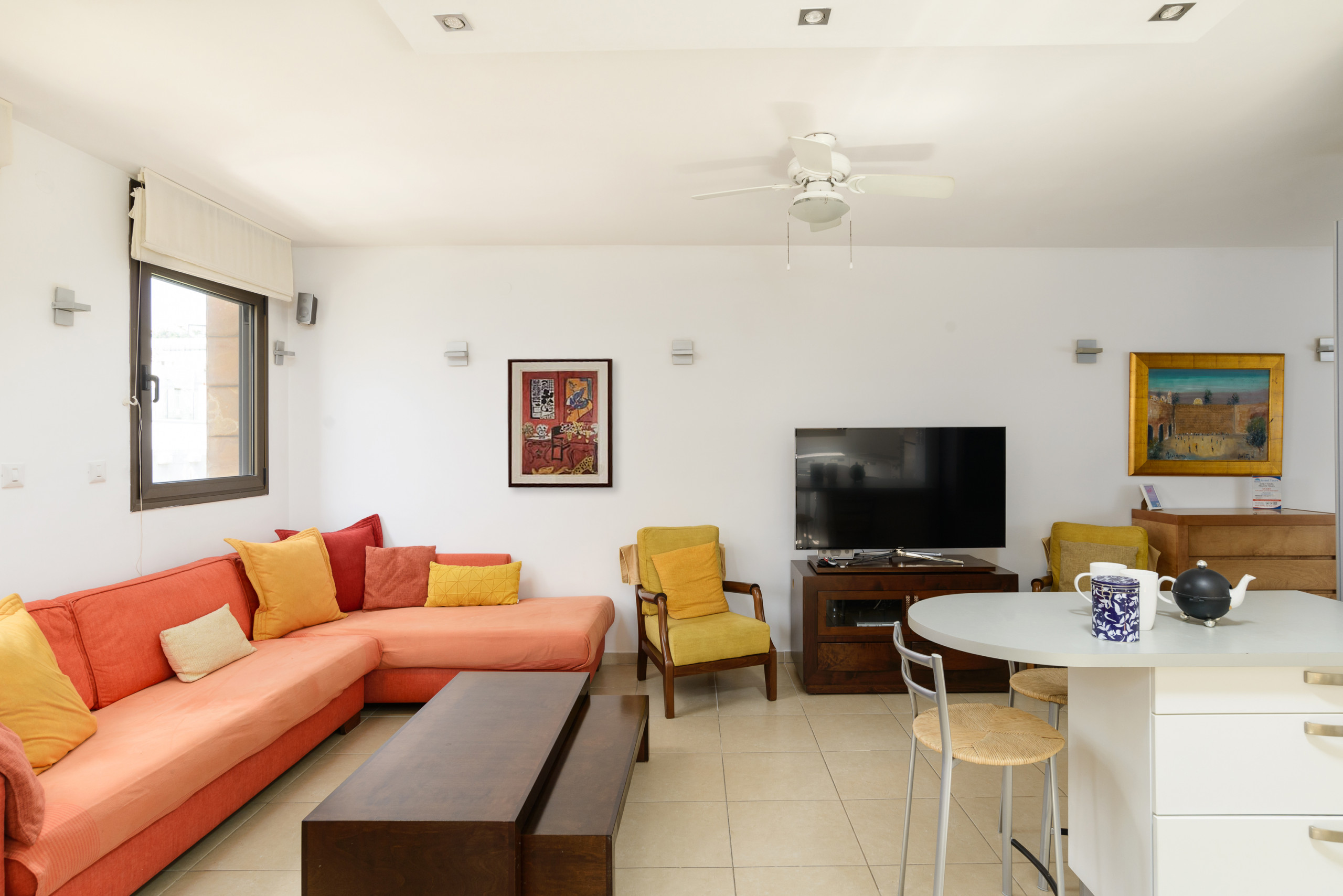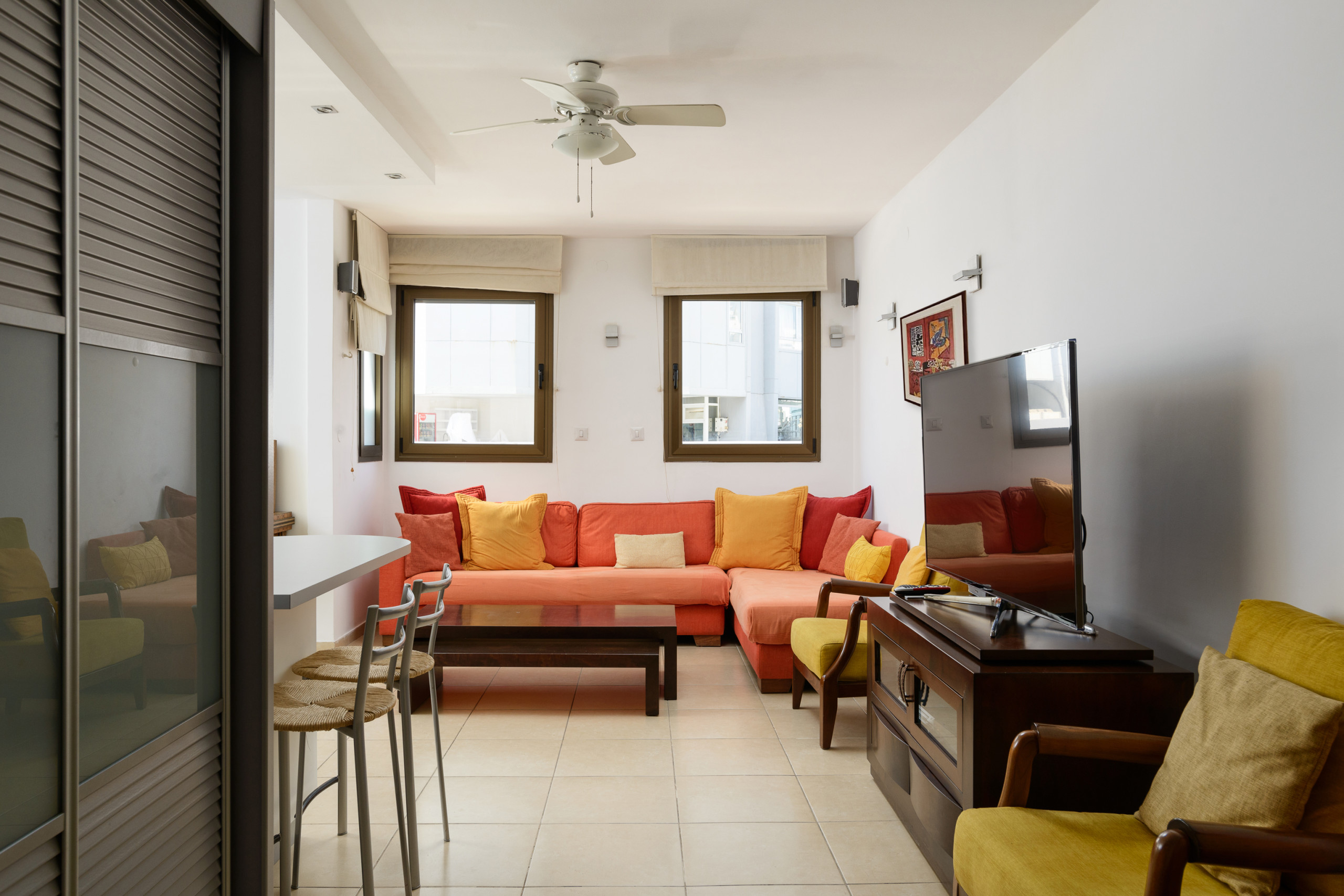 Fully furnished living room equipped with a 65" smart TV.