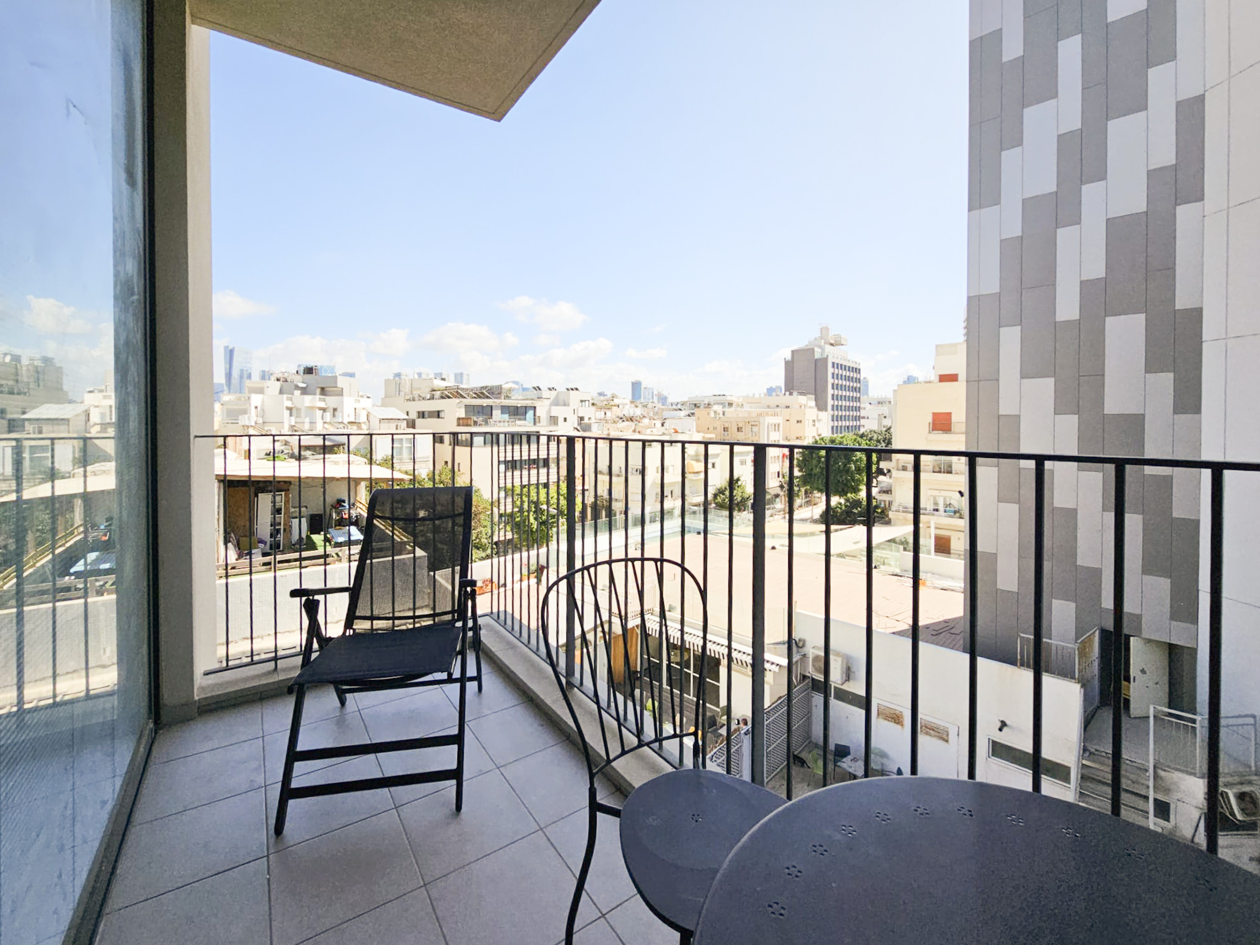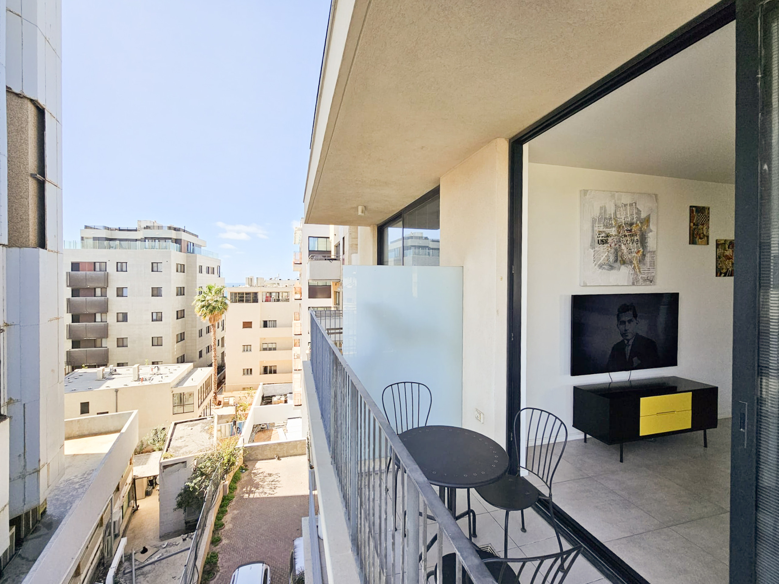 Quiet balcony overlooking the picturesque Kerem Hateimanim neighborhood and the sea.