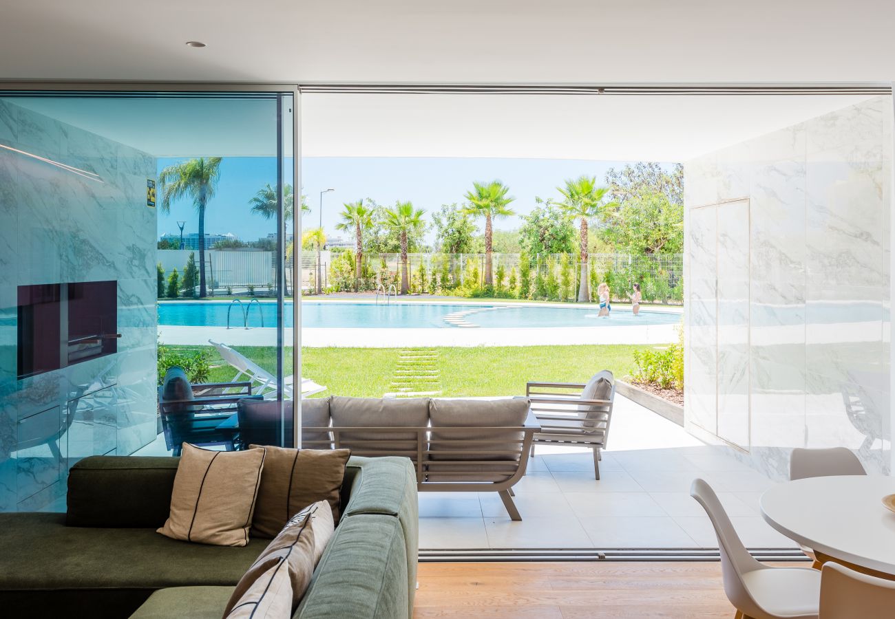 The apartment is open plan, so you have fantastic views of both the communal swimming pool and garden from the sitting and dining areas, and the kitchen. At the rear of the apartment is a large terrace, providing outdoor seating along with two deck chairs and a barbecue.