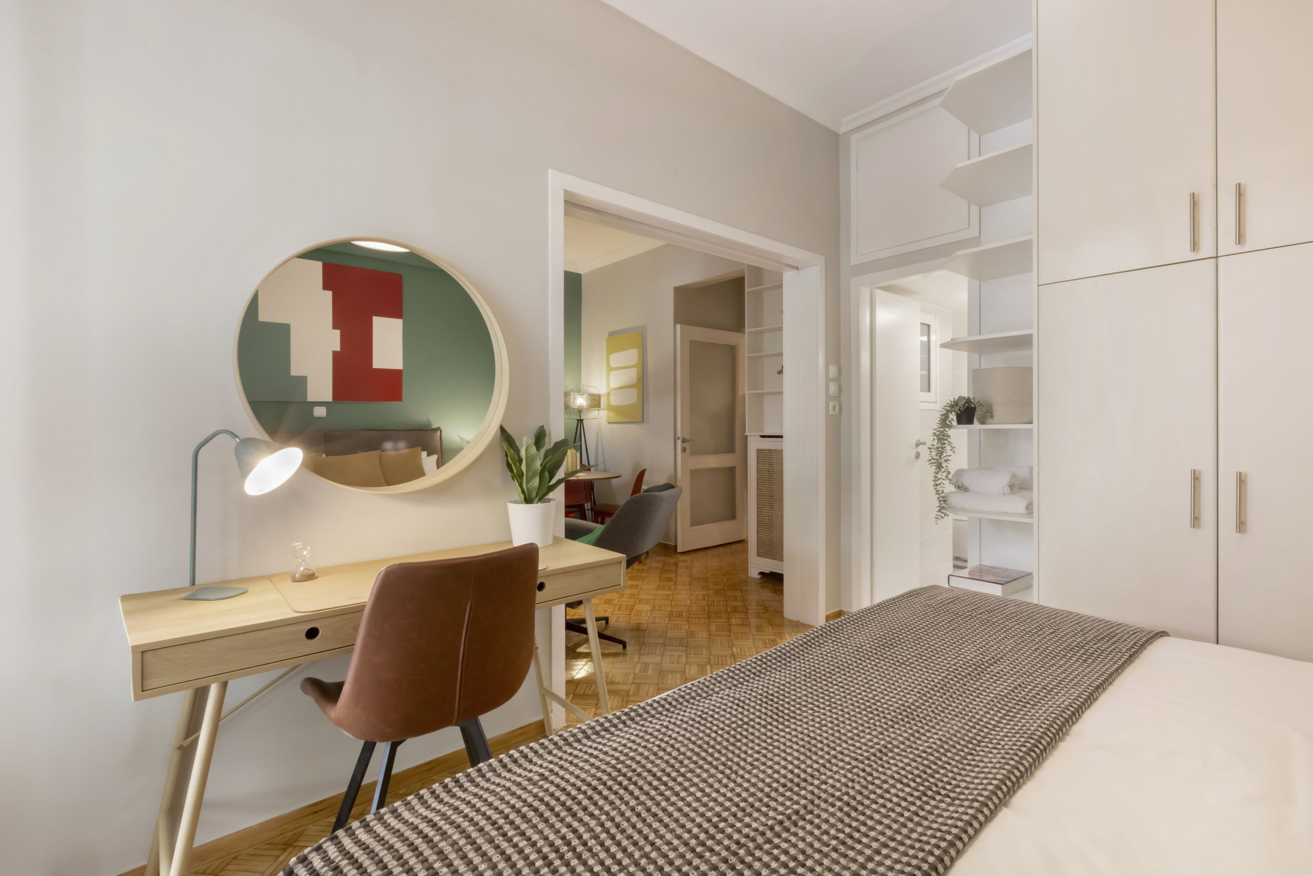 Immerse yourself in understated elegance at this large, newly renovated studio in Pagrati. With its sleek lines, soothing tones, and designer touches, it’s a calm retreat in the heart of the city. Perfect for two guests who value space, comfort, and style. The studio features a comfortable bed fitted with a premium Sealy mattress, ensuring a restful and rejuvenating sleep.