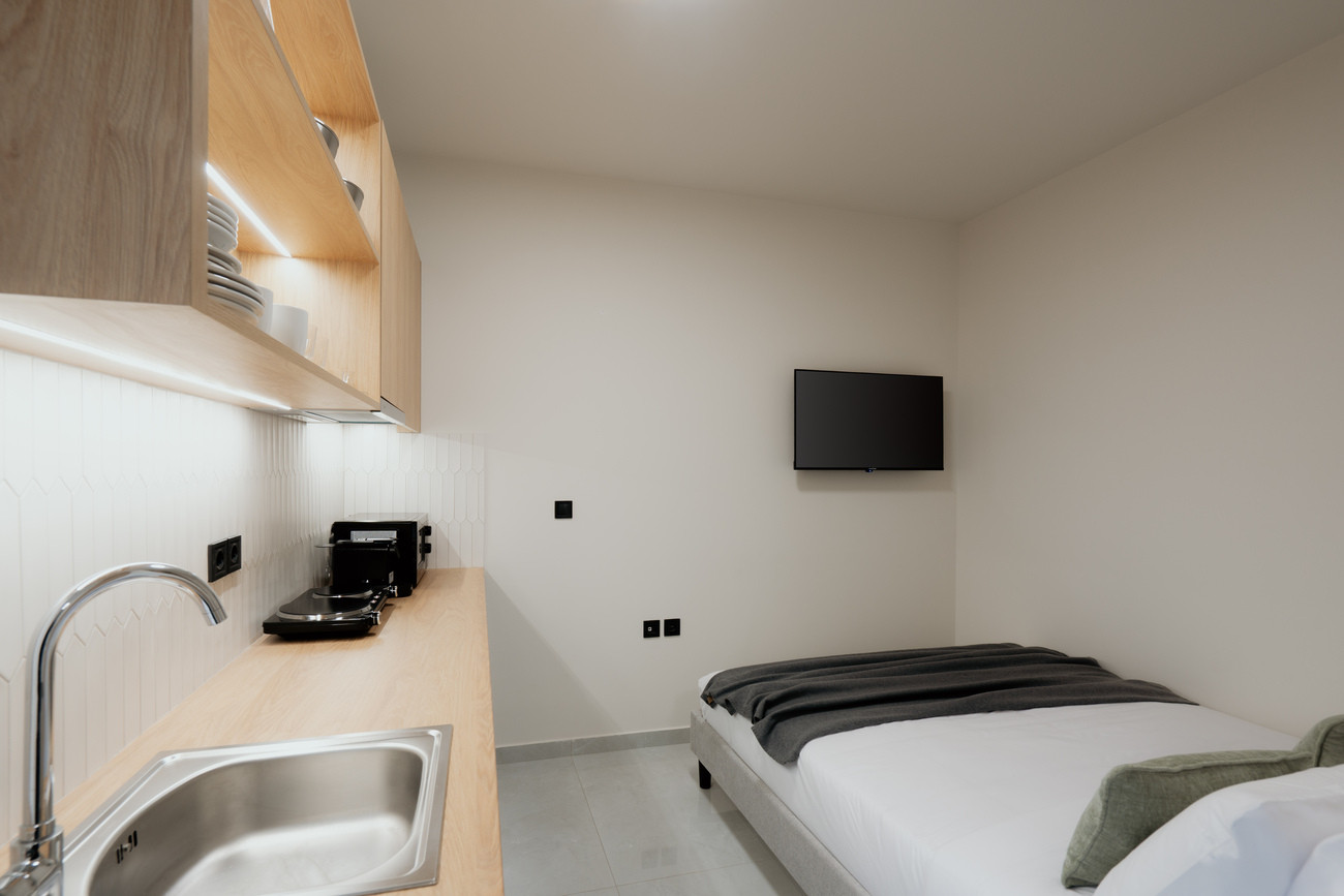 This small studio features an open-plan layout, combining living area and bedroom (comfy sofa bed for two), and kitchenette into a seamless and functional space.