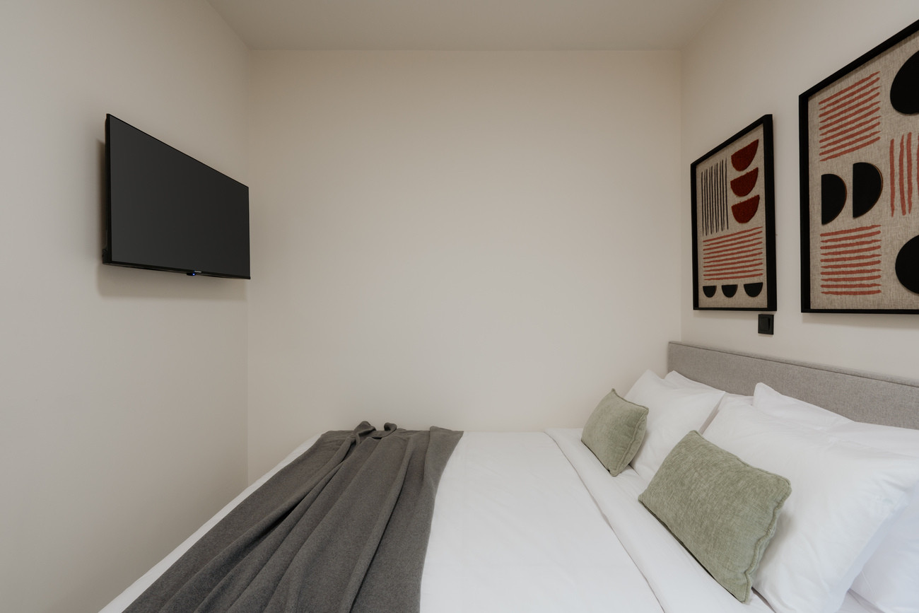 The studio features a comfortable double bed, ensuring a restful night's sleep after exploring the vibrant city. Stay connected with complimentary WiFi and unwind watching your flat-screen TV. The well-equipped kitchenette allows you to prepare quick meals, complete with a mini-fridge, microwave, coffee machine, kettle, and all necessary kitchenware. The private bathroom includes a convenient shower, providing all the comfort you need.