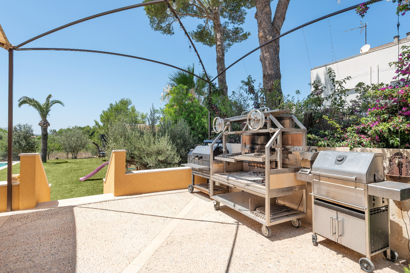 The property stands out for its spacious exteriors, perfectly maintained and designed to fully enjoy the Mediterranean climate. It features a spectacular private saltwater swimming pool measuring 16 x 4 metres and 1.6 metres deep, a children's area with swings and a trampoline, outdoor shower and comfortable sun loungers. The outdoor kitchen invites long evenings outdoors, equipped with an oven, barbecue and a cosy sofa area for relaxation. Additionally, it has a large 45 m² furnished terrace and a pleasant 15 m² porch. The outdoor parking area has capacity for 2-3 vehicles. Cot and high chair available upon request.