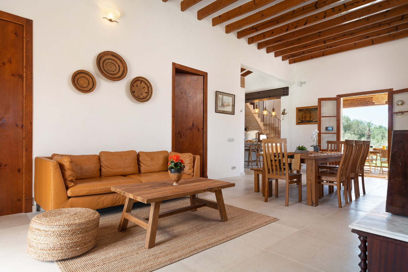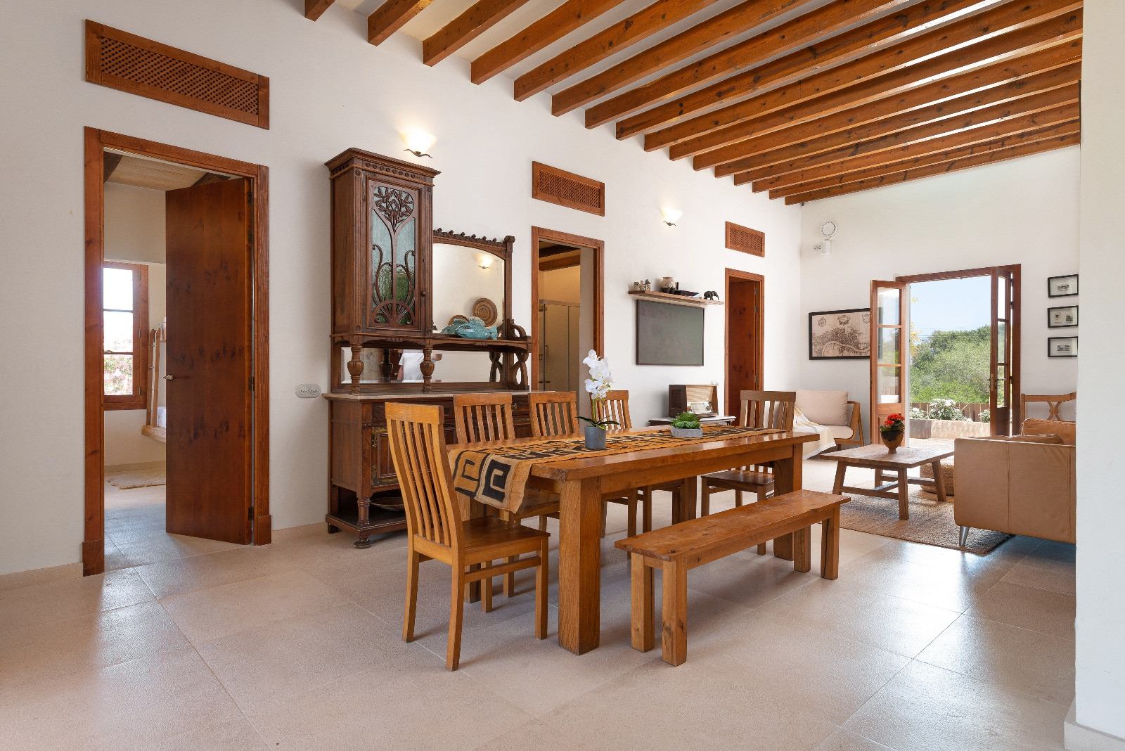 The interior of the property offers a modern, elegant, and very bright style, with all the amenities for a comfortable stay. Upon entering the house, we find a spacious living-dining room with sofa, air conditioning, high-speed wifi suitable for teleworking, and satellite television, including channels in German and English. The dining area is spacious and cosy, with chairs and a bench.