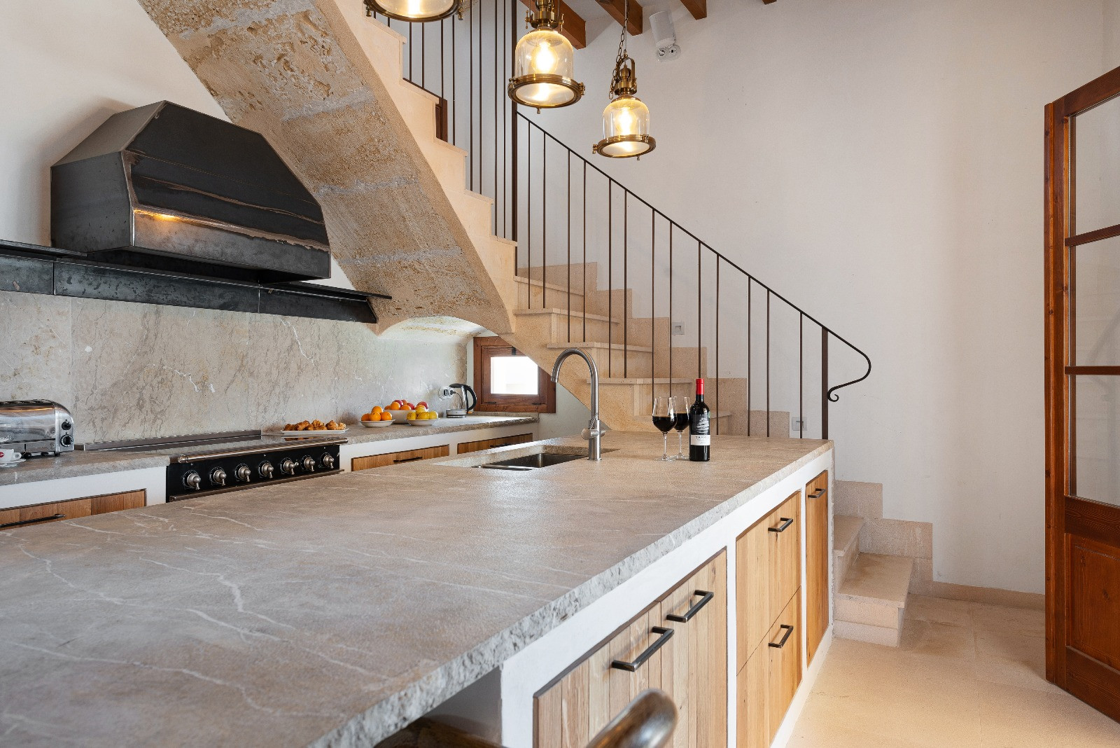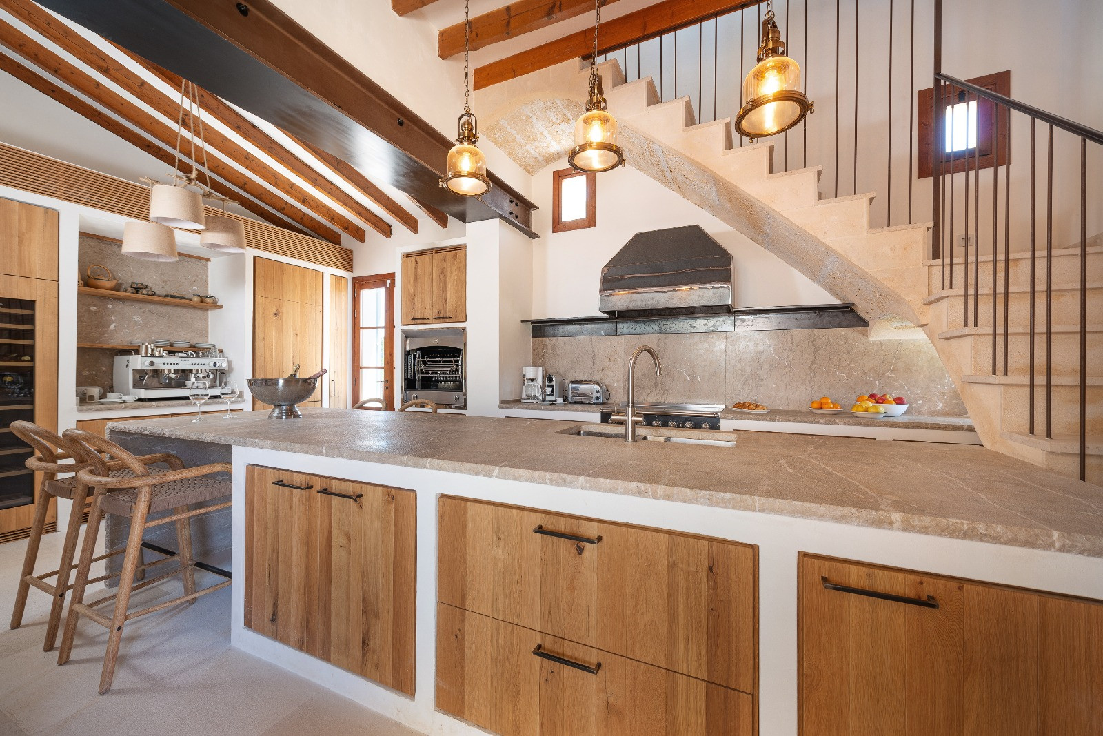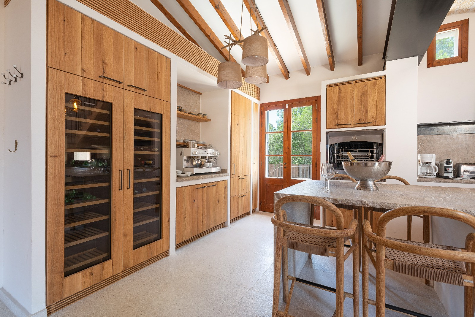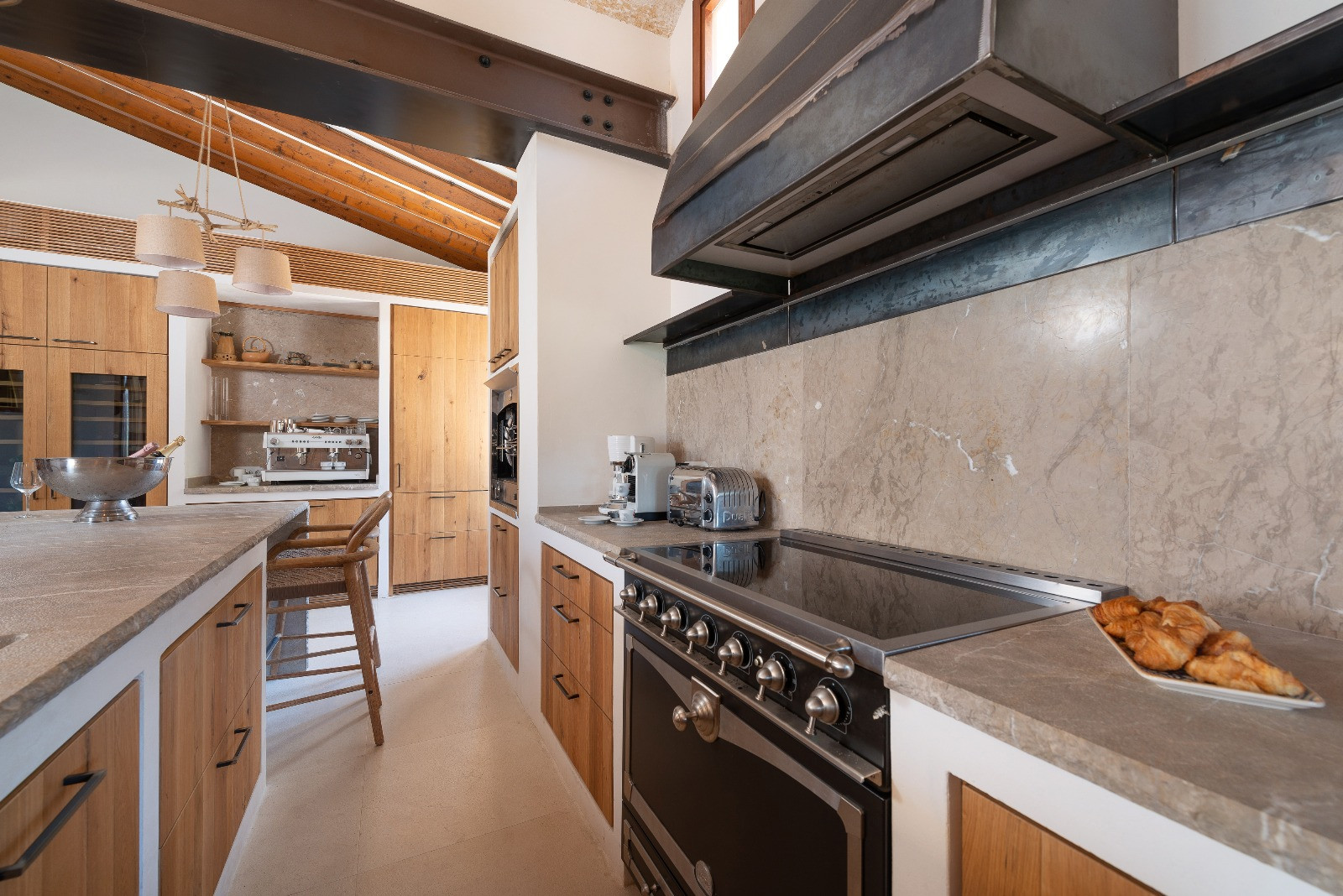 The open kitchen, with an elegant American bar, is fully equipped to prepare any dish: induction and gas hob, large fridge-freezer, electric oven, dishwasher, filter and Italian coffee maker, as well as crockery and kitchen utensils.