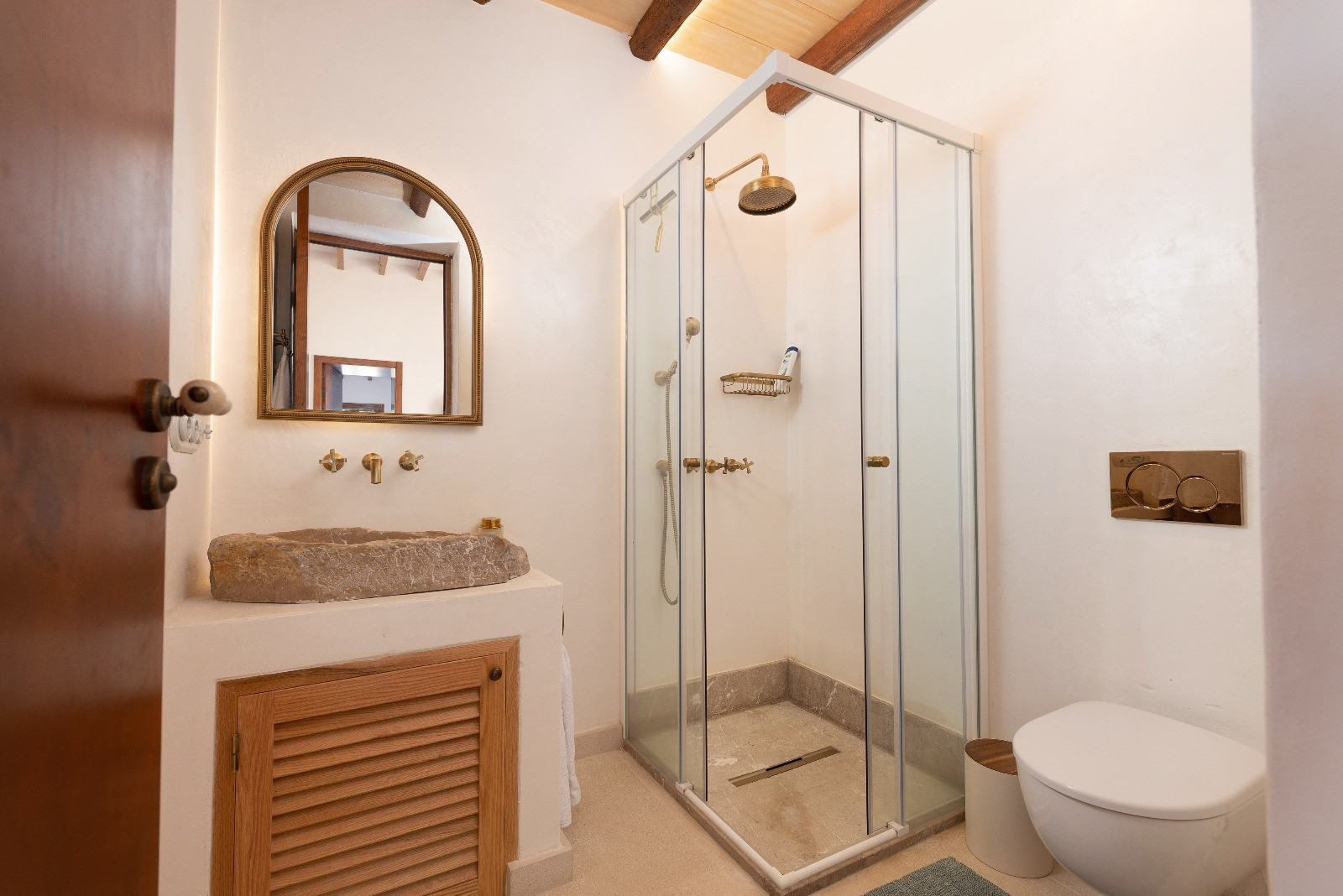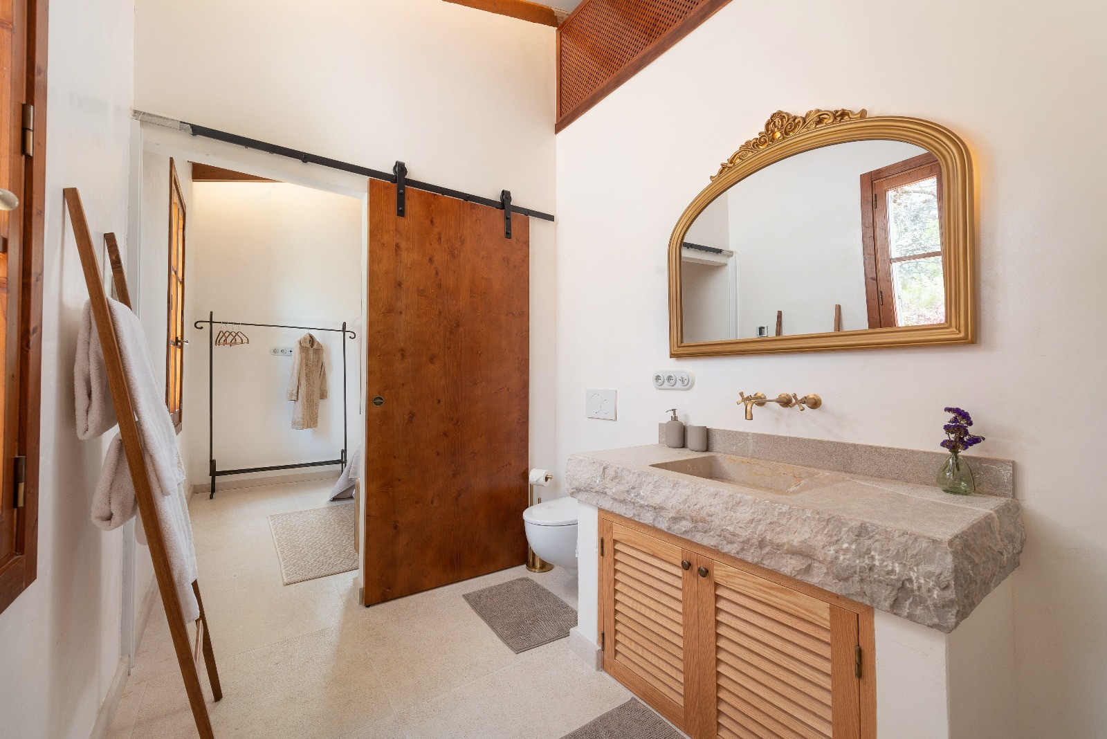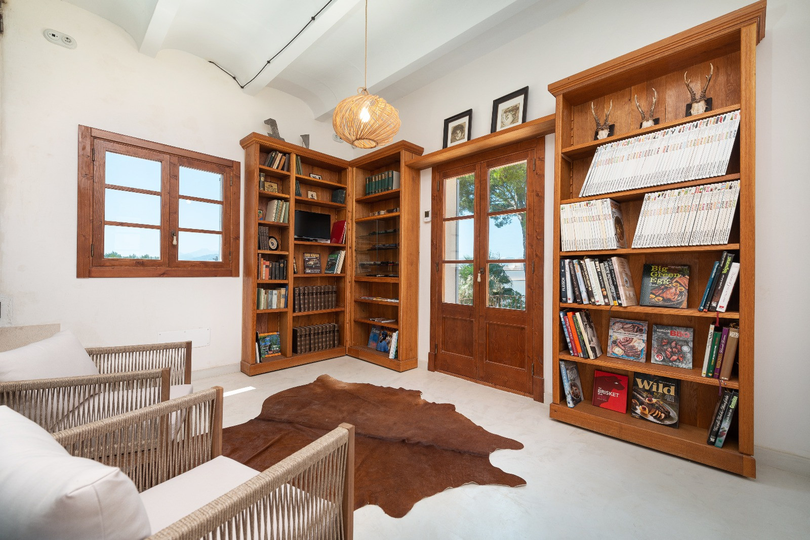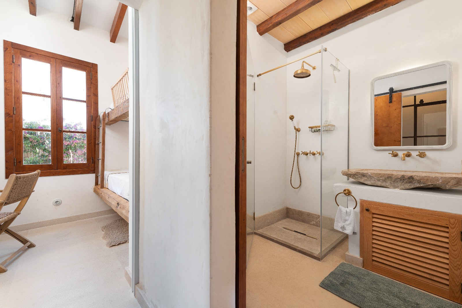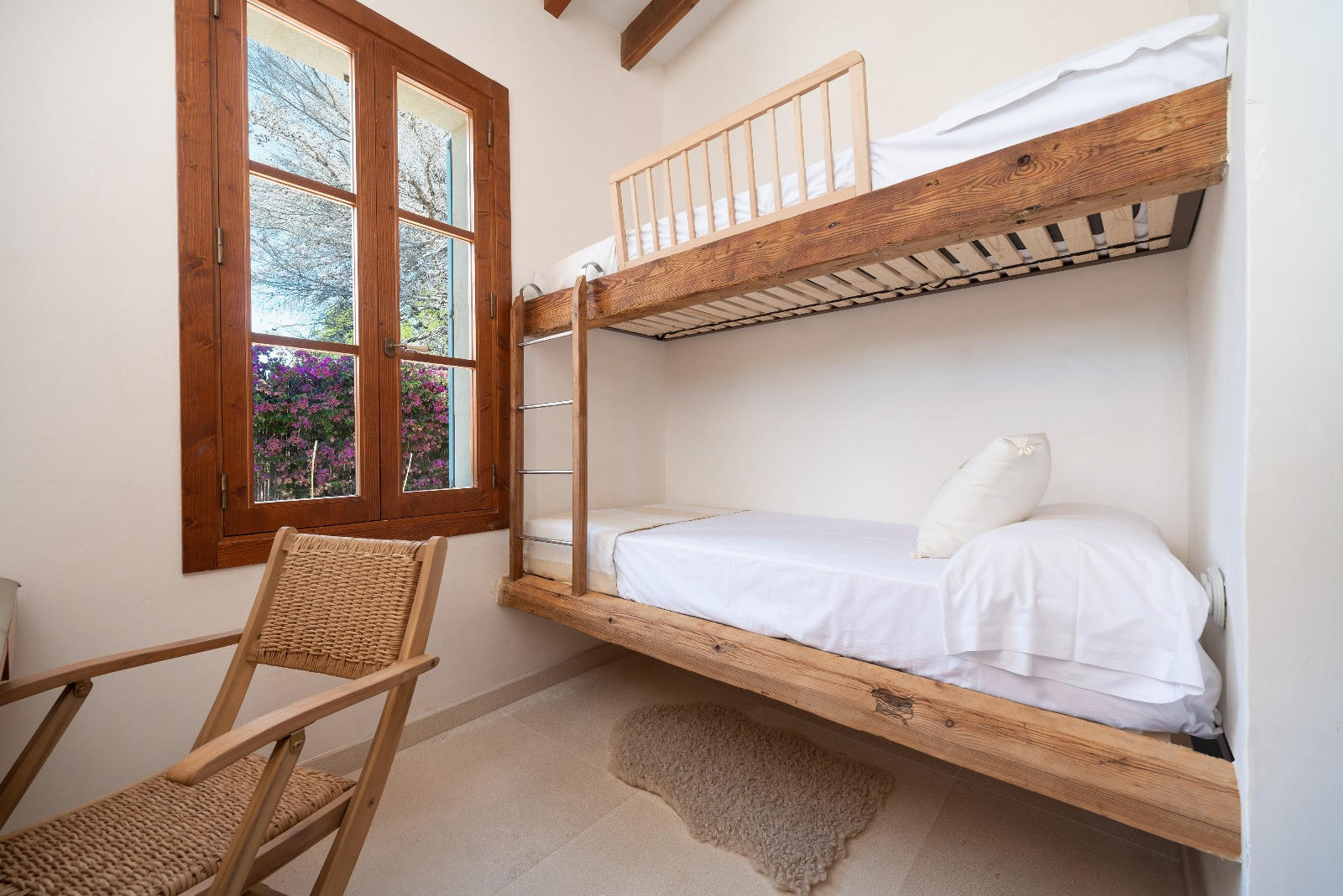 The property has five air-conditioned bedrooms: four with double beds and one with bunk beds. One of the double bedrooms has an en-suite bathroom with a shower. Additionally, there are two independent bathrooms, both with showers. On the first floor, there is a second living room, ideal as a reading or relaxation area.