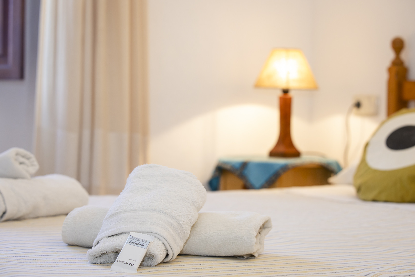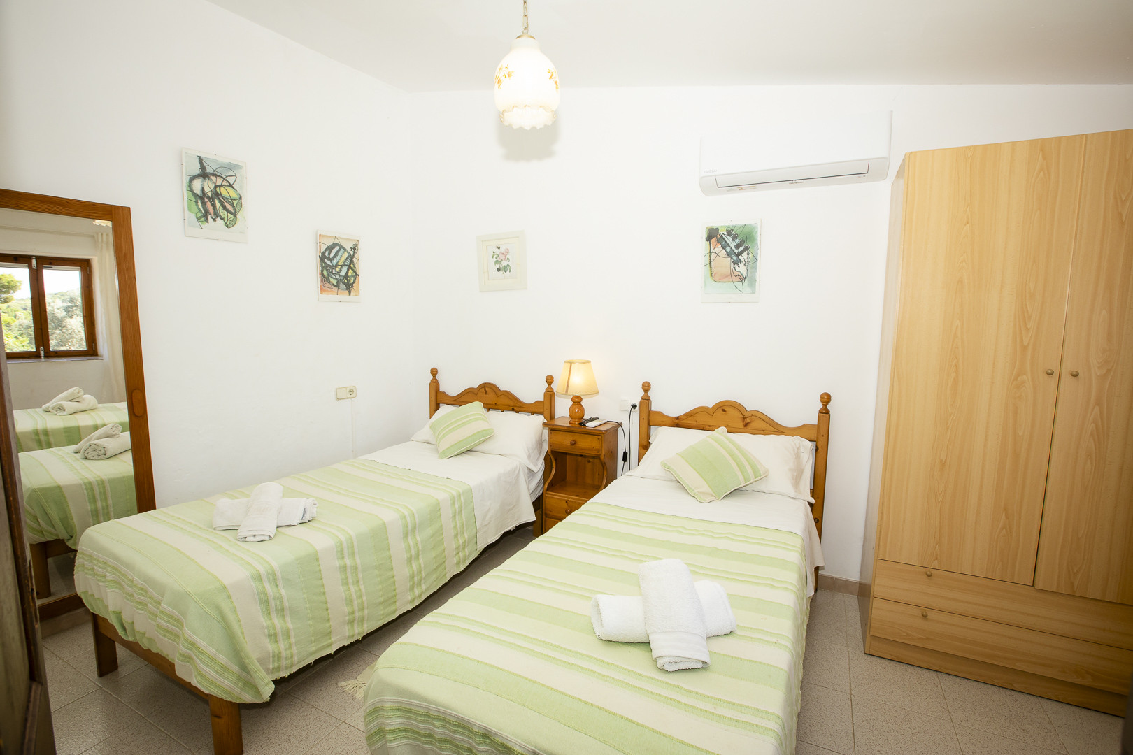 You may rest in 4 bedrooms with air conditioning, 3 of them on the first floor (two with 2 single beds and one with 1 double bed) and one on the ground floor with double bed and access to the terrace. All bedrooms have an en-suite bathroom, 3 with shower and one with a bathtub.