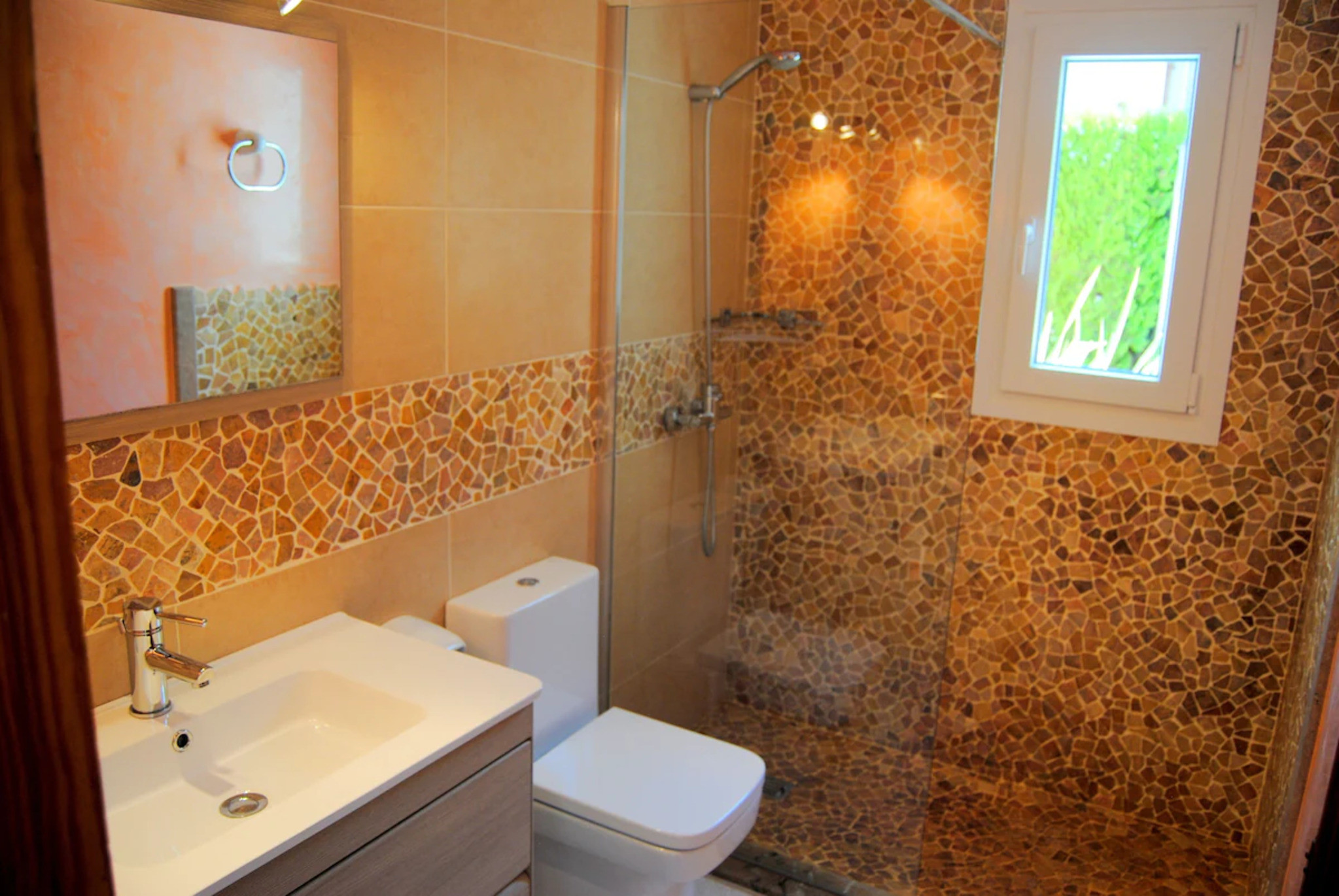 The villa features a spectacular 7 x 3 metres chlorine outdoor pool, with a depth varying between 0.5 and 1.75 metres, suitable for both children and adults. Surrounded by a spacious sunbathing area with sunbeds, it is the perfect place to relax under the Mallorcan sun. The meticulously maintained garden offers a serene and private environment. Additionally, it has a rustic furnished porch, ideal for outdoor meals or enjoying a barbecue with family or friends. For added convenience, the property includes an outdoor bathroom and shower. Children will have their own fun space in the playground with a slide. Parking is free and located outside the property.